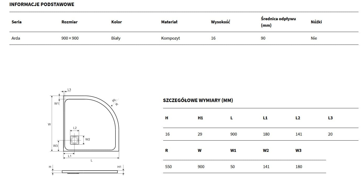 Arda Brodzik kompozytowy półokrągły, biały BREX.1504.090.090.WHN