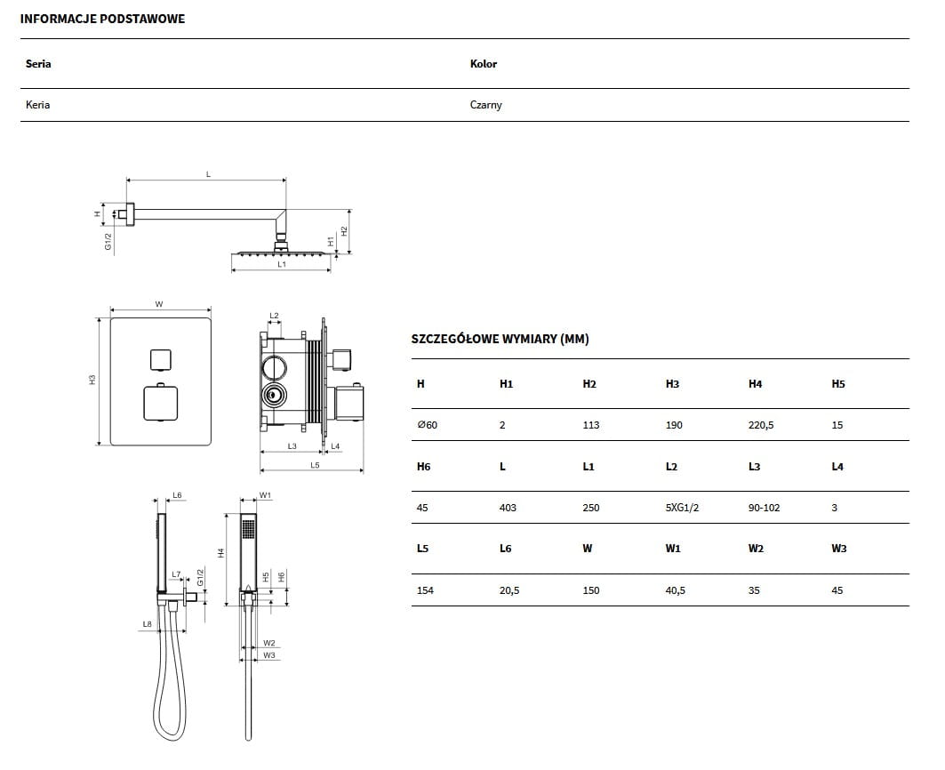Głowica kwadratowa 250x250 mm z ramieniem kwadratowym może być instalowana na wybranej wysokości, a zestaw punktowy będzie idealnym rozwiązaniem dla użytkowników, którzy nie chcą moczyć włosów podczas krótkiej kąpieli.