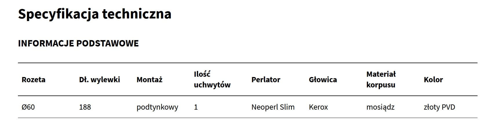 Bateria umywalkowa podtynkowa posiada wylewkę o zasięgu 188mm, może być instalowana na wymaganej wysokości nad umywalką. Dzięki temu z powodzeniem może być stosowana do umywalek nablatowych bez otworu na baterię. Posiada głowicę Kerox. Jej idealnym uzupełnieniem będą korki umywalkowo-bidetowe w kolorze złotym lub białym (dopasowanym do koloru ceramiki).