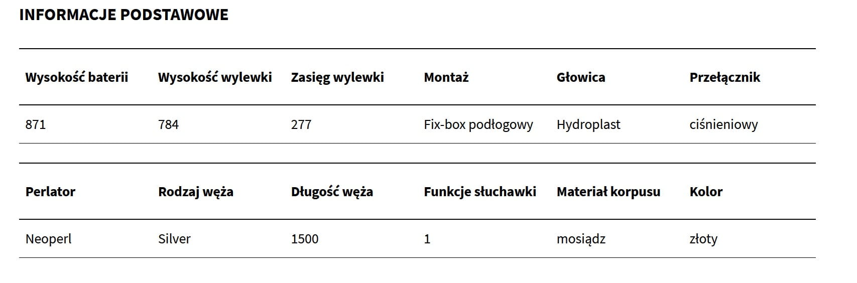 Bateria wannowa wolnostojąca wykonana jest z chromowanego mosiądzu, posiada wylewkę o wysięgu 259 mm i może być stosowana do większości wanien wolnostojących. Wymaga montażu podłogowego przy zastosowaniu Fix-box'a. Posiada wbudowaną głowicę Hydroplast, mechaniczny przełącznik funkcji słuchawka/wylewka.