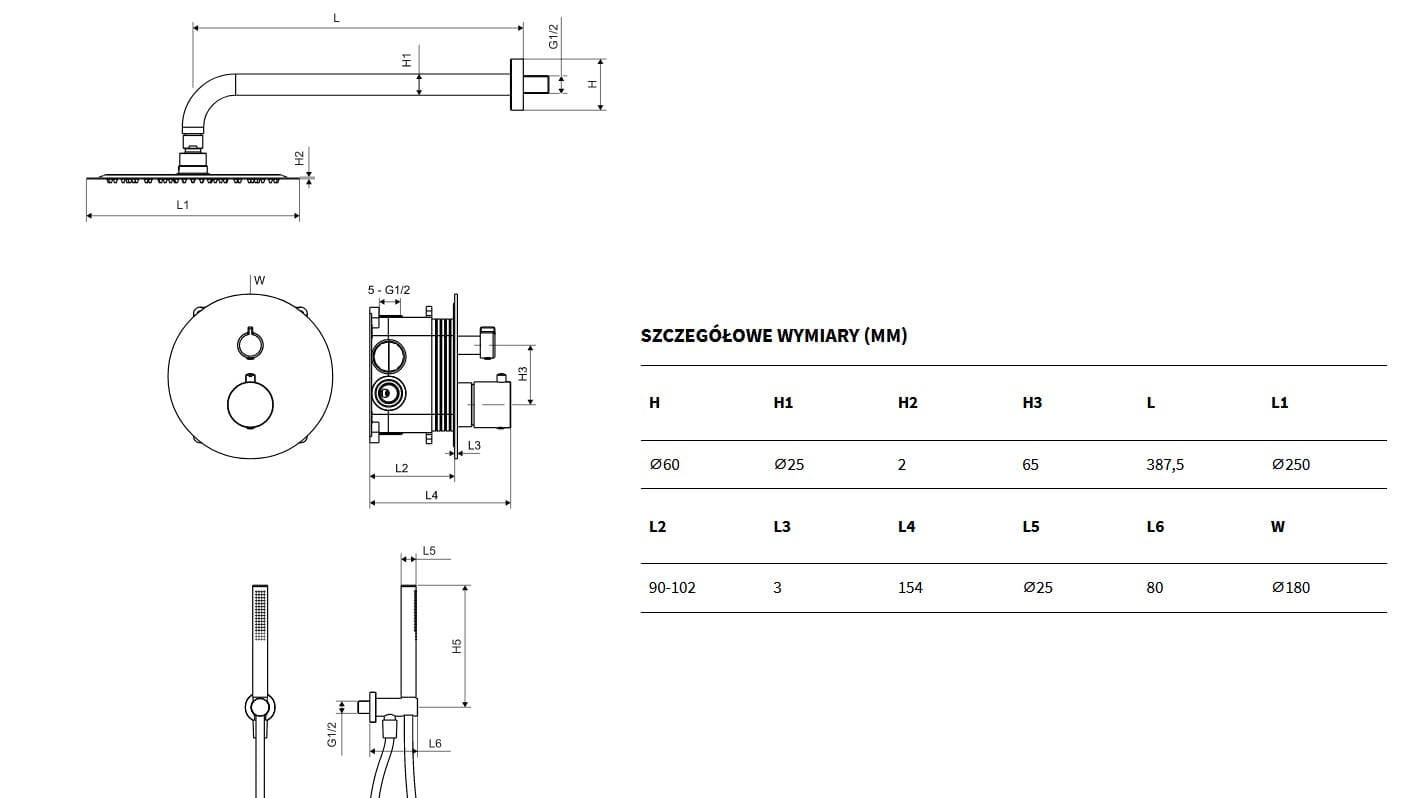 Głowica okrągła 250mm z ramieniem okrągłym może być instalowana na wybranej wysokości, a zestaw punktowy będzie idealnym rozwiązaniem dla użytkowników, którzy nie chcą moczyć włosów podczas krótkiej kąpieli.