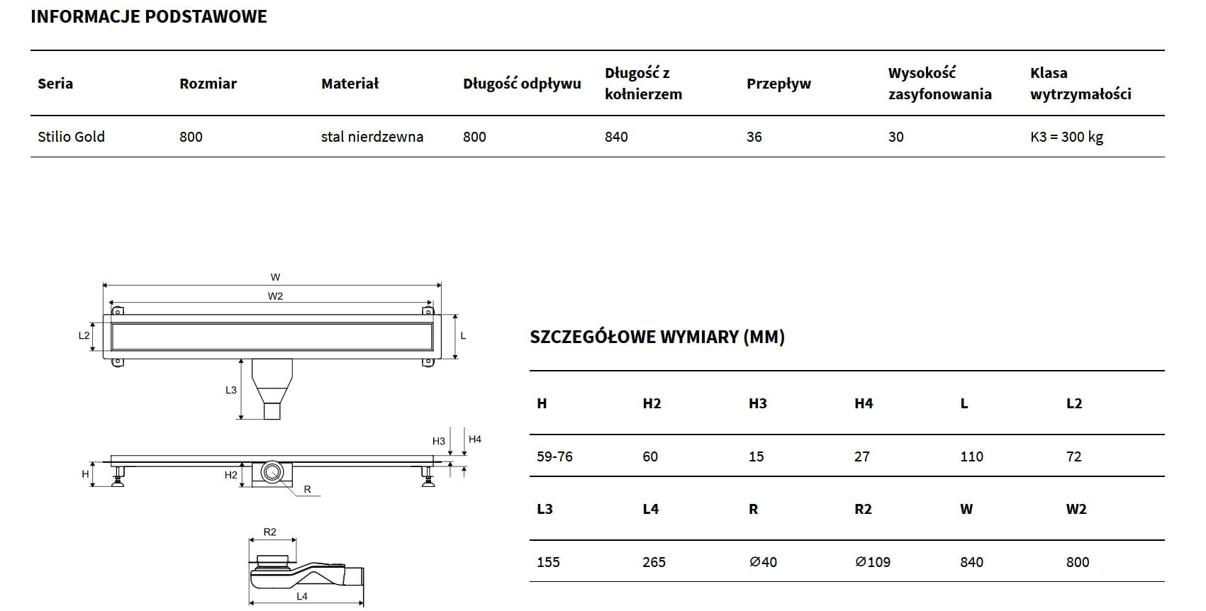 W zestawie odpływów Stilio Gold znajduje się polerowany ruszt dekoracyjny. Dostępna jest również wersja z rusztem do wklejenia płytek ceramicznych. Odpływ dostosowany jest do płytek o standardowej grubości 8-12 mm. Wysoką jakość użytych materiałów potwierdza wysoka klasa odporności na obciążenie K3 (obciążenie do 300 kg).