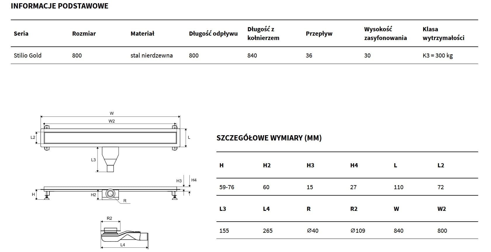 W zestawie odpływów Stilio Gold znajduje się ruszt z polerowaną ramką do wklejenia płytki. Odpływ dostosowany jest do płytek o standardowej grubości 8-12 mm. Dostępna jest również wersja z polerowanym rusztem dekoracyjnym. Wysoką jakość użytych materiałów potwierdza wysoka klasa odporności na obciążenie K3 (obciążenie do 300 kg).