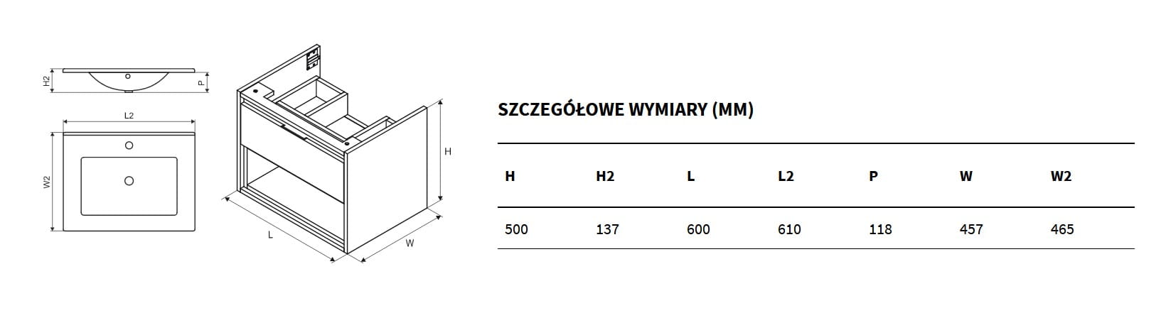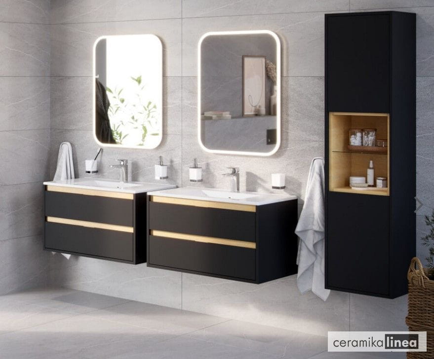 Zestaw uzupełnia ceramiczna umywalka meblowa AS o szerokości 60cm, dopasowanej do rozmiaru szafki. Umywalka ma przelew i otwór na armaturę. Po bokach znajduje się płaska przestrzeń na odkładanie przedmiotów.