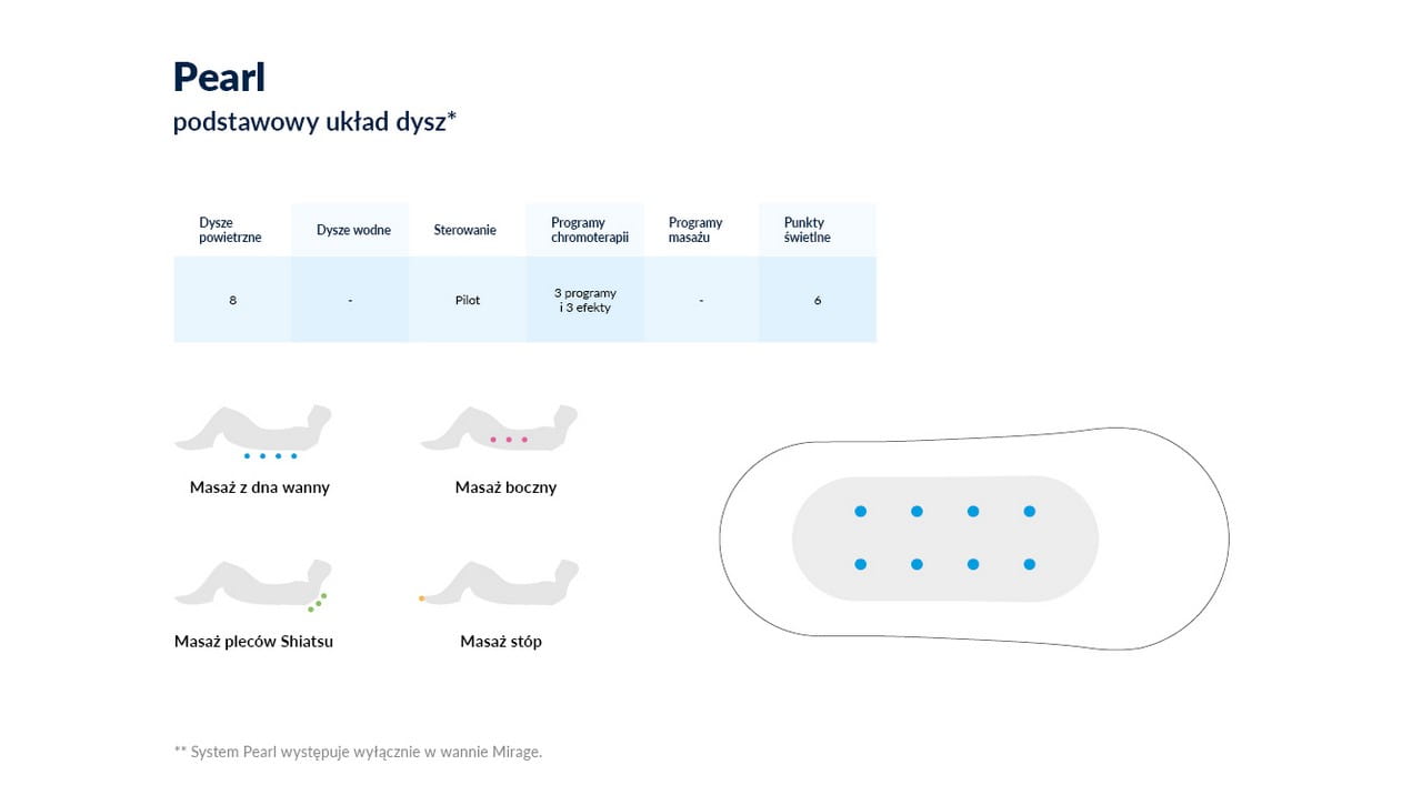 - unikatowa budowa systemu powodująca równomierne podświetlenie wody i ciała przez zastosowanie wielopunktowego oświetlenia.